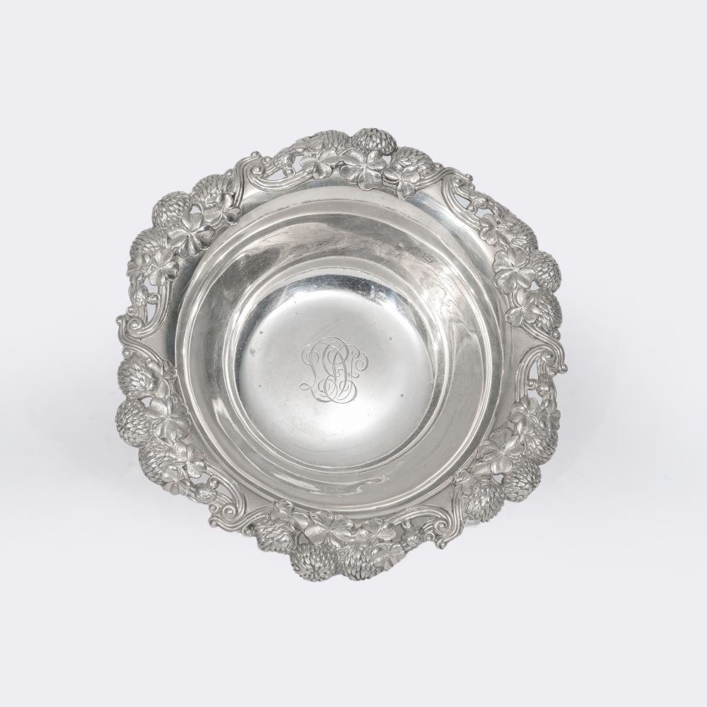 New York. 1902-1907. Sterling silver, marked, TIFFANY & Co., MAKERS, STERLING SILVER, 13780 (pattern no.), 367 (order no.), C (= Charles T. Cook). Deep round bowl, open-worked sculptural rim with chrysanthemums and cloverleafs, ligatured monogr. in the mirror, h. 5.5 cm, dm. 23 cm, weight approx. 165 g
