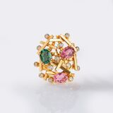 18 ct. yellow gold, marked. In prong setting 3 tourmalines in pink and green in oval cut and with 13 bezelset diam. in transition and round brilliant cut in total approx. 0.40 ct. White (H) - Slightly Tinted White (J), VS-P. Ringtop 26 x 24 mm, size 53, weight approx. 11,5 g. -