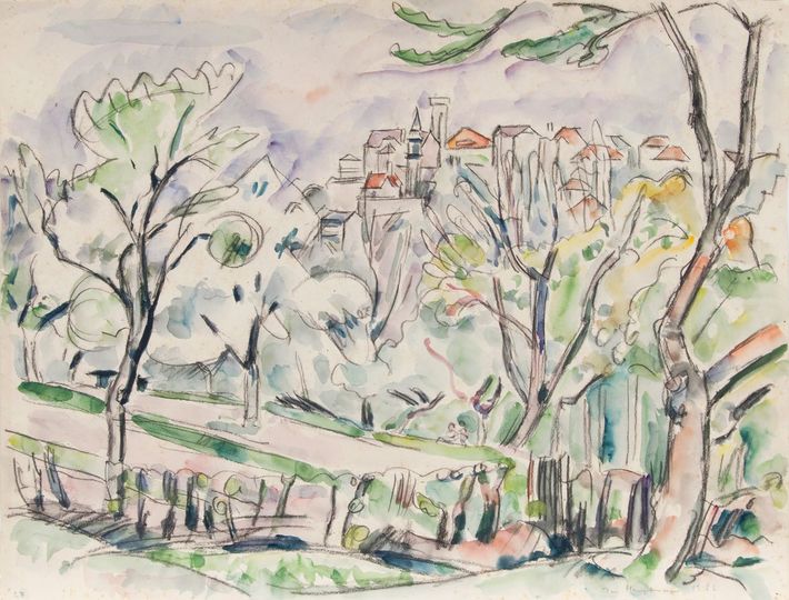 Aquarell, 46 x 60 cm, r. u. sign. und dat. Ivo Hauptmann 1922, ungerahmt. - Landschafts-, Stilleben- und Figurenmaler, Sohn des Nobelpreisträgers Gerhart Hauptmann. H. begann sein Studium 1903 an der Académie Julian in Paris, wo er auch die Ateliers von Maillol, Bonnard, Denis und Vuillard besuchte. Er setzte seinen Unterricht an der Kunstschule Lewin-Funcke in Berlin fort, sein Lehrer dort war L. Corinth. 1904-08 folgte ein Studium an der Weimarer Akademie bei H. Olde sowie als Meisterschüler von L. von Hofmann. Dort schloß er Freundschaft mit H. Arp, H. van de Velde und E. Munch; O. Mueller kannte er bereits aus Dresden. 1909-12 war er wiederum in Paris und freundete sich mit P. Signac an, mit dem zusammen er 1911 auch beim Salon des Indépendants ausstellte. H. lebte in der Folge abwechselnd in Hamburg, Dresden und Berlin, wo er zu den Gründungsmitgliedern der Freien Sezession gehörte. Nachdem er sich endgültig in Hamburg niedergelassen hatte, trat er 1927 auch der dortigen Sezession bei. Nach dem Zweiten Weltkrieg war H. Dozent an der Landeskunstschule in Hamburg, zudem bis 1965 Vizepräsident der Freien Akademie der Künste. Er wurde 1961 mit dem Bundesverdienstkreuz und 1964 mit dem Edwin-Scharff-Preis geehrt, die Stadt Hamburg verlieh ihm 1973 außerdem den Professorentitel. H. gehörte zu den Hauptmeistern der Avantgarde in Deutschland, dem es wie wenigen anderen gelungen ist, die Leichtigkeit von Licht und Farbe in der Landschaft ins Bild zu setzen. Mus.: Paris (Louvre), Hamburg (Kunsthalle, Altonaer Mus.), Schleswig (SHLM) u.a. Lit.: Thieme-Becker, Vollmer, Bénézit, Der Neue Rump, I. H., der Poet der Farbe, 2007 u.a.
