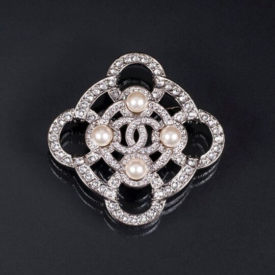 Metall, silberfarben, Strass, mit perlmuttfarbenen Glasperlen (Dm. 6 mm). Im Zentrum das 'CC' Logo, verso Plakette gemarkt 'Chanel A16 B Made in France'. 50 x 50 mm. Box. -