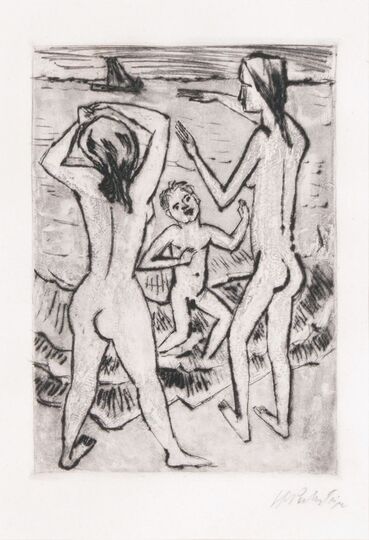 Kaltnadelradierung, 24 x 17 cm, r. u. mit Bleistift sign. HM Pechstein, unter Passepartout und Glas gerahmt, ungeöffnet. - Literatur: WVZ: Krüger R134. - Deutscher Maler und Graphiker der 'Brücke', einer der bedeutendsten Expressionisten. Nach einer Ausbildung zum Maler studierte P. an der Gewerbeschule und an der Akademie Dresden, zuletzt 1903-06 als Meisterschüler von O. Gussmann. Bereits 1906 schloß er sich der Künstlergruppe 'Brücke' an. Im Jahr darauf ermöglichte ihm ein Stipendium, Italien und Paris zu bereisen. P. ließ sich anschließend in Berlin nieder, wo er Mitglied der Secession und Präsident der Neuen Secession wurde, was 1912 zu seinem Ausschluß aus der 'Brücke' führte. 1918 gehörte er zu den Gründungsmitgliedern der 'Novembergruppe'. Die Professur an der Berliner Akademie, die er seit 1923 innegehabt hatte, wurde ihm 1933 von den Nationalsozialisten entzogen. 1937 wurde er auch aus der Akademie ausgeschlossen und zahlreiche seiner Werke in der Ausstellung 'Entartete Kunst' gezeigt. Er verbrachte die innere Emigration überwiegend in Pommern. Bereits 1945 wurde P. wieder Professor an der Akademie der Künste in Berlin und erhielt in der Folge zahlreiche Ehrungen und Auszeichnungen. Seine Werke wurden 1955 posthum auf der Documenta I ausgestellt. Mus.: Berlin (Brücke-Museum, Nat.-Gal.), Dresden (Gem.-Gal.), Köln (Mus. Ludwig, Wallraf-Richartz-Mus.), Zwickau (Pechstein-Mus.), Zürich (Kunsthaus), Ludwigshafen (Wilhelm-Hack-Mus.) u.a. Lit.: Thieme-Becker, Vollmer u.a.