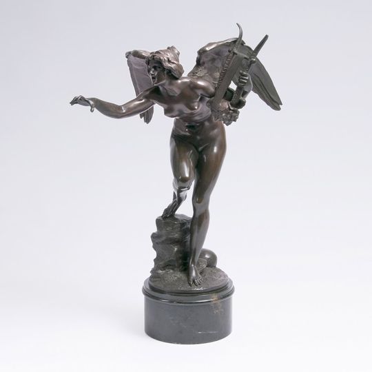 Um 1900. Bronze, dunkel patiniert. Auf der Oberseite der Plinthe sign. 'Rud. Hölbe Dresden', am Plinthenrand Gießerstempel 'Guss Pirner & Franz Dresden'. Figur: H. 58 cm, Marmorsockel: H. 11 cm. - Deutscher Bildhauer, studierte an der Akademie in Leipzig und Dresden, seit 1886 zeigte er Figuren mythologischen oder historischen Charakters und Genrestatuetten auf deutschen Ausstellungen und erhielt zahlreiche Preise, die Manufaktur Meissen erwarb von ihm 1897-1899 einige Figuren und Gruppen. Zu seinen Hauptwerken zählt u.a. die Kolossalgruppe 'Kunst' über dem Haupteingang des Albertinums Lit.: Thieme/Becker 17/18, S. 202.