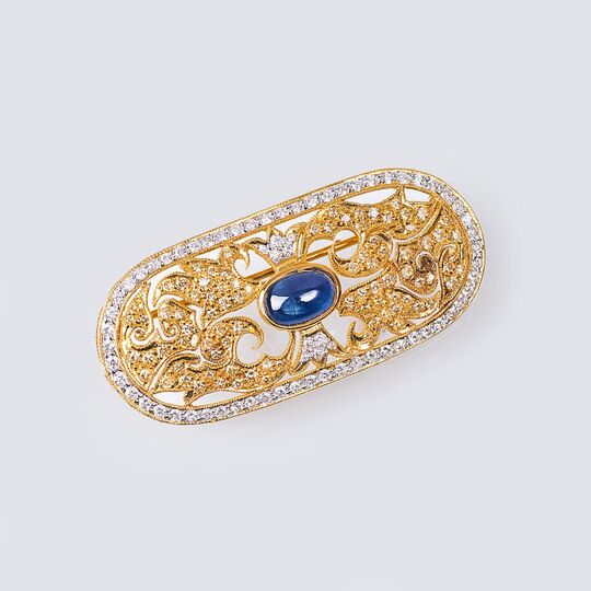 18 kt. GG mit WG, gest. Floraler Durchbruch-Dekor, im Zentrum 1 ovaler Saphir-Cabochon (8 x 5 mm) mit zweifarbigem Brillant-Besatz von 156 Brill. zus. ca. 1,55 - 1,60 ct. Feines Weiß(G)-Getönt(S).vvs-vs. 44 x 20 mm, Gew. ca. 9 g. -