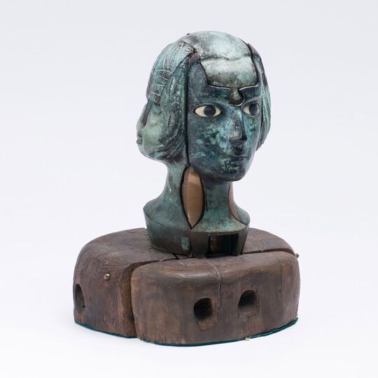 Bronze, grün patiniert, auf Holzsockel. Aus der Serie der Kolumbus-Köpfe. Mehrteiliger, auseinandernehmbarer Kopf mit drei Gesichtern, davon die Hauptansicht mit eingelegten Marmoraugen, im innersten eine Stele mit 4 Gesichtern. Sockel bez. 'COLÓN DESCUBRIDOR DE SI MISMO', sign. Barón, num. Ex. '78/1492' (die Nummerierung ist vermutlich eine Anspielung auf die Entdeckung Amerikas). Kopf: H. 28 cm, Sockel: H. 9 cm. - Provenienz: Ehemals Slg. Fritz van Ankum/Imme Reich-van Ankum, Inhaber der Galería Arabal, Alicante. - Spanischer Bildhauer, studierte von 1949-1954 an der Kunsthochschule San Fernando in Madrid, Stipendiat in London, Yale und Rhode Island, seit 1960 zahlreiche Ausst. und Auszeichnungen, aus den 70er Jahren stammen vorwiegend multiple bewegliche und umgestaltbare Plastiken aus Metall und Holz. Lit.: Saur AKL 7, S. 123f.; Maria Teresa Ortega Coca: Francisco Baron, 1989.