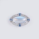 Um 1920. Platin, 14 kt. GG. In Millegriffesfassung der ovale Mondstein-Cabochon ca. 12,50 ct. (ca. 22 x 11 x 6 mm) und 120 kl. Rosendiamanten sowie 8 Saphire im variierenden Trapezschliff. 32 x 22 mm, Gew. ca. 11,2 g. - Provenienz: Hofjuwelier Leonhard Treusch (1876 - 1954), seit dem frühen 20. Jh. Fa. C. E. Keyser Juwelier-, Gold- und Silberwarenhandlung, Leipzig, seitdem im Familienbesitz -