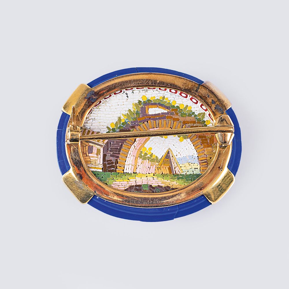 Anf. 20. Jh. 18 kt. Roségold. Ovales Bildnis (Italien, 19. Jh.), vorderseitig Blumenboquet, rückseitig antiker Torbogen in Ruinenlandschaft. 29 x 24 mm, Gew. ca. 8 g. - Provenienz: Hofjuwelier Leonhard Treusch (1876 - 1954), seit dem frühen 20. Jh. Fa. C. E. Keyser Juwelier-, Gold- und Silberwarenhandlung, Leipzig, seitdem im Familienbesitz -