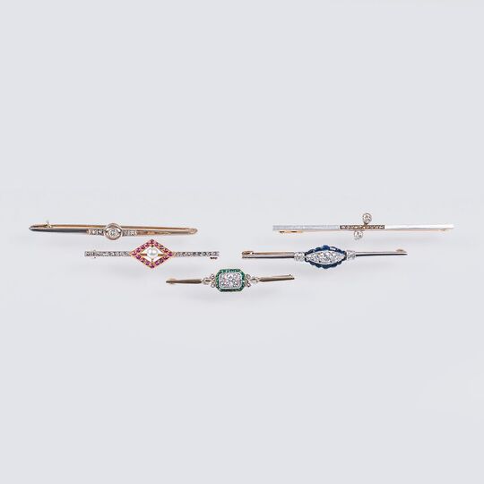 Anf. 20. Jh. Platin, 14 kt. GG, tlw. gest. Altschliffdiam. insges. ca. 0,65 ct.: 1 Nadel mit 2 Altschliffdiam. zus. ca. 0,15 ct., 10 Rosendiam. (60 x 9 mm); 1 Nadel mit 1 Altschliffdiam. ca. 0,07 ct., 4 Rosendiam. (55 x 6 mm); 1 Nadel mit 6 Rosendiam., 6 Altschliffdiam. zus. ca. 0,18 ct., 20 kl. Smaragden im Trapez- und Baguetteschliff (41 x 7 mm); 1 Nadel mit 1 Perle (wohl Natur, Dm. 4 mm), 16 runden Rubinen, 16 Rosendiam. (43 x 10 mm); 1 Nadel mit 5 Altschliffdiam. zus. ca. 0,25 ct., 14 Saphiren und 8 Rosendiam. (54 x 8 mm). Gew. zus. ca. 17,5 g. - Provenienz: Hofjuwelier Leonhard Treusch (1876 - 1954), seit dem frühen 20. Jh. Fa. C. E. Keyser Juwelier-, Gold- und Silberwarenhandlung, Leipzig, seitdem im Familienbesitz -