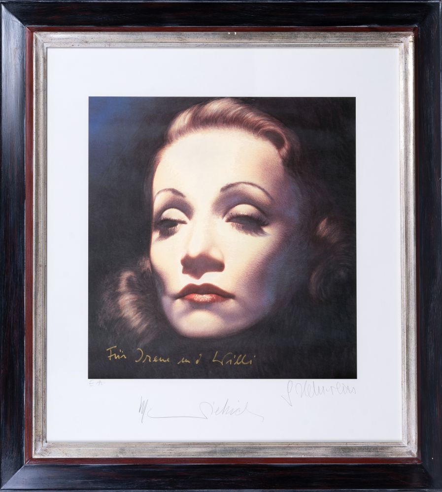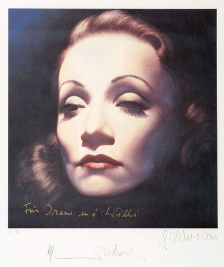 Farboffsetlithographie, 50 x 50 cm, r. u. mit Bleistift sign. G. Helnwein, l. u. num. E.A., mit Signatur in Bleistift M. Dietrich, gewidmet 'Für Irene und Willi', unter Glas gerahmt, ungeöffnet. - Österreichisch-irischer Künstler. H. studierte 1969-73 bei R. Hausner an der Akademie Wien. Bestimmend in seinen hyperrealistischen Bildern sind häufig Kinder, die Themen Gewalt und Verletzungen. Der Künstler lebt und arbeitet in Los Angeles und in Irland. In den siebziger Jahren begann er Elemente der Pop-Kultur aufzugreifen, teils als Geste der Ablehnung einer bürgerlichen Ästhetik, teils aus Interesse am Verhältnis zwischen der sogenannten hohen und der Unterhaltungskultur. Helnweins Werke wurden in den bedeutendsten Museen der Welt ausgestellt. Mus.: Wien (Albertina), Los Angeles (LACMA, Getty Mus.), St. Petersburg (Russ. Mus.), Köln (Mus. Ludwig), Essen (Folkwang-Mus.), Nürnberg (Germ. Nat.-Mus.) u.a.