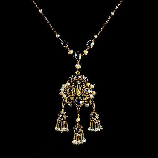 Ende 19. Jh. 18 kt. GG mit Silber, undeutl. gest. Filigran-Hänger mit 14 Saphiren im Rund- und Kissenschliff sowie 54 kl. Saatperlen variierender Formen. Knebel-Verschluss. 70 x 30 mm, Kette L. 51,5 cm, Gew. ca. 11,6 g. Paris. - Provenienz: Nachlass Gräfin Finck von Finckenstein-Brinkama -