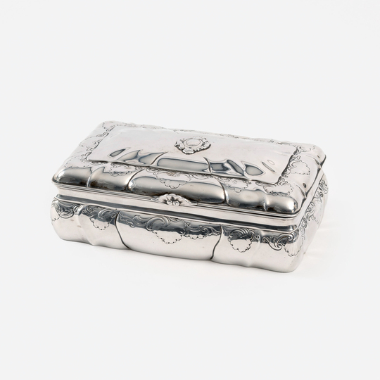 Kopenhagen. 1917. Sterlingsilber. Marken: 925S, Beschauzeichen CHF, Meisterzeichen Michelsen, 1917, EF EP. H. 6,3 x 17 x 10,5 cm, Gewicht ca. 510 g. Teilweise berieben. Rechteckige, passig geschweifte Schatulle mit Scharnierdeckel, umlaufend gravierter Muschel- und Voluten-Dekor. Deckel mit Kartusche