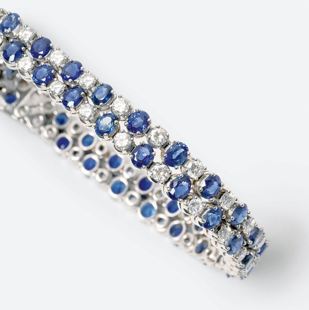 18 kt. WG, gest. Umlaufend hochwertiger Besatz mit 50 farbfeinen Saphiren im Oval-Schliff von je ca. 0,18 bis 0,35 ct. (von ca. 3,9 x 3 x 1,8 mm bis ca. 5 x 3,6 x 2,1 mm) sowie mit 50 weißen Brill. zus. ca. 4,50 ct. Feines Weiß(F/G)-Weiß(H).vvs. B. 7 - 9 mm, L. 18,7 cm, Gew. ca. 31 g. -