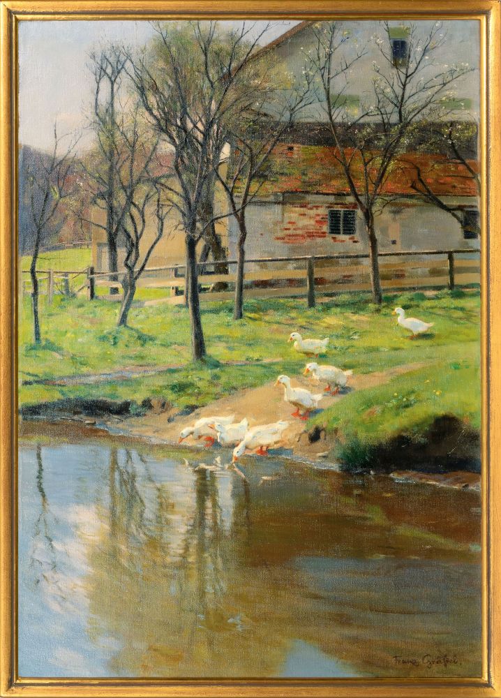 Nach 1930. Öl/Lw. 101 x 71 cm. R. u. sign. Franz Gräßel, auf dem Keilrahmen bez. 'Bauernhof im Frühling'. Unauffällige Retuschen. - Ausstellungen: Das Gemälde war ausgestellt: Franz Xaver Grässel. Toni-Merz-Museum Sasbach, 2011 - Literatur: Das Gemälde ist publiziert: Katalogheft zur Ausstellung, Toni-März-Museu 2011, Abb. S. 20 - Deutscher Tier- und Landschaftsmaler. G. studierte 1878-84 an der Akademie Karlsruhe bei C. Hoff, 1886-90 studierte er erneut bei W. Lindenschmit an der Münchener Akademie, wo er 1911 auch Professor wurde. Seit 1894 malte er überwiegend Enten und Gänse. Seine Charakterisierungen der Tiere in ihrem Lebensraum gehören zu den besten Leistungen des Genres. Mus.: Berlin (Nat.-Gal.), München (Neue Pinakothek), Freiburg/Br., Glasgow, Nürnberg u.a. Lit.: Thieme-Becker, Bénézit.