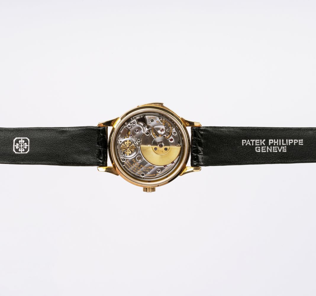 1991. 18 kt. GG gest., Automatik. Minutenrepetition, Kal. R 27 PS, Ref. 3979, Werknummer 1904028. Porzellanweisses Zifferblatt m. schwarzen römischen Zahlen u. kleiner Sekunde, bez. PATEK PHILIPPE GENEVE u. SWISS. Schieber für die Minutenrepetition bei 9 Uhr. Sichtboden aus Glas, zusätzlicher Boden 18 kt. GG gest. u. gemarkt u.a. m. Meisterzeichen JHP für Jean-Pierre Hagmann. Schwarzes Patek Philippe Lederarmband m. Dornschließe GG gest. Annähernd neuwertiger Zustand. Dm. ca. 33 mm, Gew. ca. 50 g. Mit Karton u. Holzbox sowie Patek Philippe Archivauszug vom 9.10.2023 u. Gangprotokoll vom 28.08.2023. Zum 150jährigen Jubiläum der Manufaktur entwickelte Patek Philippe mit der Referenz 3979 die erste automatische Minutenrepetition der Firmengeschichte in einer Armbanduhr. Anknüpfend an die bedeutenden Errungenschaften in der Vergangenheit und den unprätentiösen Stil des Hauses wurde das hochkomplizierte Werk in einem lediglich 33,4 mm großen Gehäuse des legendären Jean-Pierre Hagmann präsentiert und dokumentiert die Fähigkeit der Manufaktur nicht nur auf technischem, sondern auch auf ästhetischem Gebiet. Mechanik, die die Grenzen des Machbaren markiert, in Gehäusen von zeitloser Eleganz und Schlichtheit, prägt die DNA von Patek Philippe und findet in diesem gesuchten Modell ihre perfekte Entsprechung. Soweit bekannt, wurden von dieser Referenz lediglich ca. 100 Exemplare hergestellt, was die Uhr zu einem der begehrtesten Sammlerstücke der Manufaktur macht. Umso mehr freuen wir uns, Ihnen diese Rarität aus einer Hamburger Privatsammlung präsentieren zu dürfen. -
