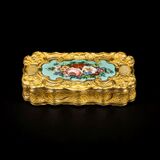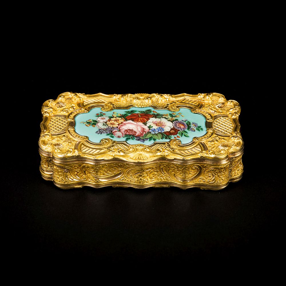 Wohl Schweiz. Um 1850. 14 kt. GG, gest. mit österreichischer Importmarke (1868-72), polychromes Emaille. Geschweifte rechteckige Form, allseitig reicher ziselierter und punzierter Reliefgolddekor im Rokokostil, auf dem Deckel Emaille-Kartusche mit farbigem Blumenbouquet. 2 x 8 x 4,5 cm, ca. 80 g -
