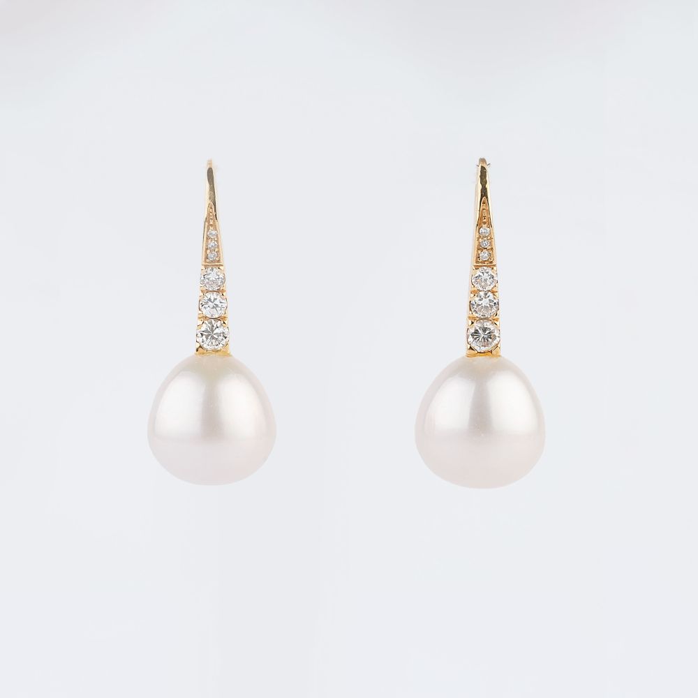 18 kt. GG. Die cremeweißen Südsee-Zuchtperlen in leichter Tropfenform (ca. 14 x 13,5 mm). Feste Brisurstege insges. mit 12 Diam. im Brillant- und 8/8-Schliff zus. ca. 0,60 ct. Weiß(H).vvs-P. Haken-Ohrringe. 34 x 13,5 mm, Gew. ca. 10 g. -