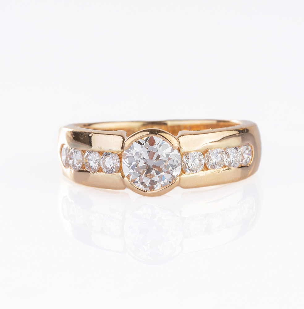 18 kt. GG, gest. Insges. Brillant-Besatz von ca. 1,40 ct.: zentraler Brillant ca. 0,85 ct. Weiß(H). SI. mit 8 kl. Brillanten in Kanalfassung zus. ca. 0,55 ct. Feines Weiß(G)-Weiß(H). VVS-SI. Weite 54, Gew. ca. 6,5 g. -