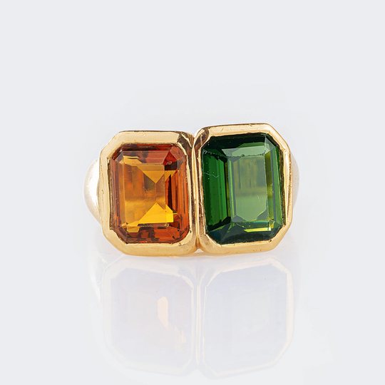 18 kt. GG, gest., MZ: HvH. Im Emeraldschliff ein dunkelgrüner Turmalin ca. 3,50 ct. (ca. 10,5 x 8,3 x 4,9 mm) und ein braun-oranger Citrin ca. 2,70 ct. (ca. 9,6 x 8,1 x 5,1 mm). Weite 49/50, Gew. ca. 16,1 g. -