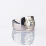 14 kt. WG, gest., poliert und mattiert. Schauseitig verbreitert mit weißem Similistein im Kissenschliff. Weite 59, Gew. ca. 19,2 g. -