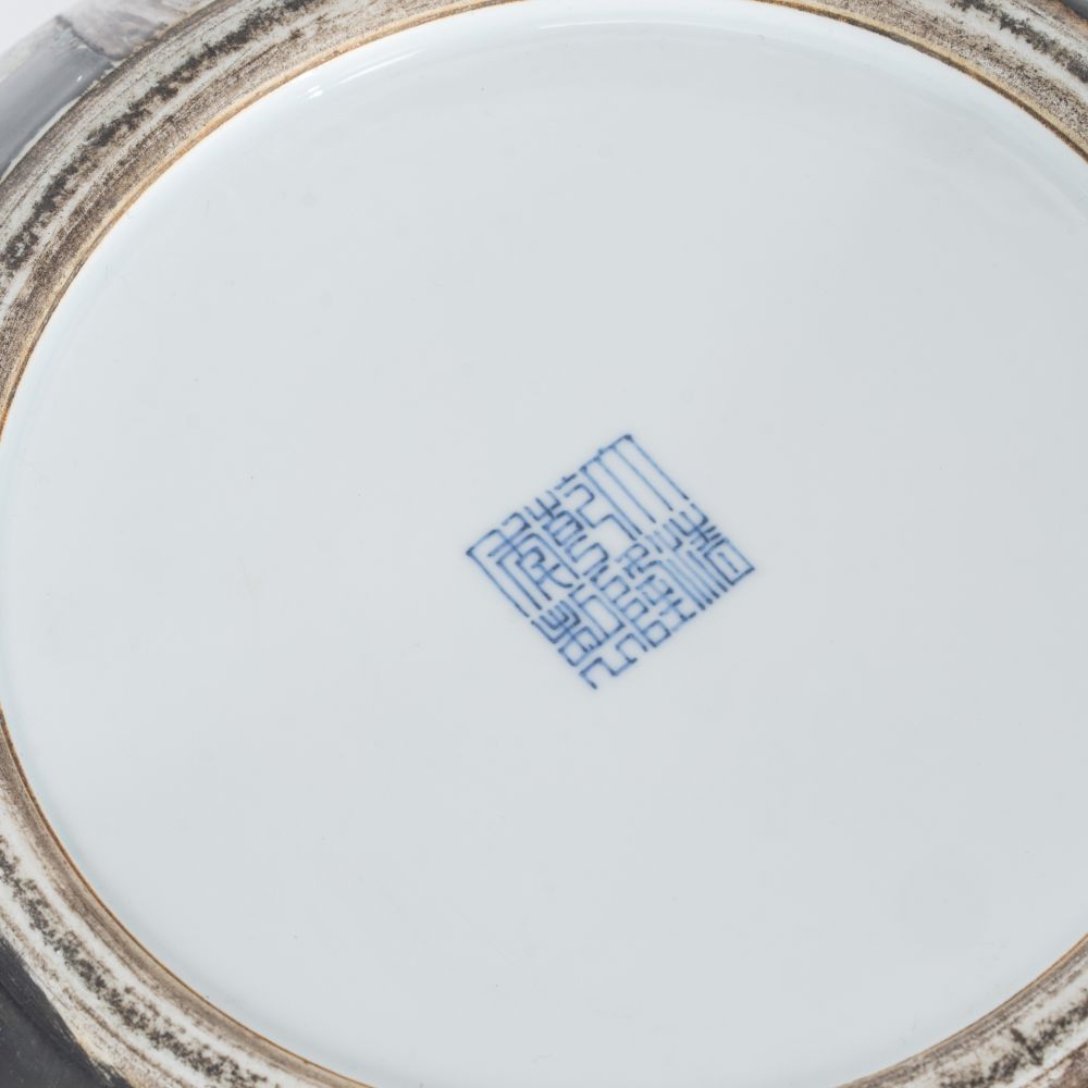 China. Qianlong-Marke in Zhuanshu, 20. Jh. Porzellan, farbige Emaille-Bemalung. H. 52 cm. Am Boden unterglasurblaue Qianlong-Marke in Zhuanshu. Große Flaschenvase mit schwarzem Fond. Die Wandung umlaufend dekoriert mit 9 großen Pfirsichen an Blütenzweigen sowie 9 spielenden Knaben -