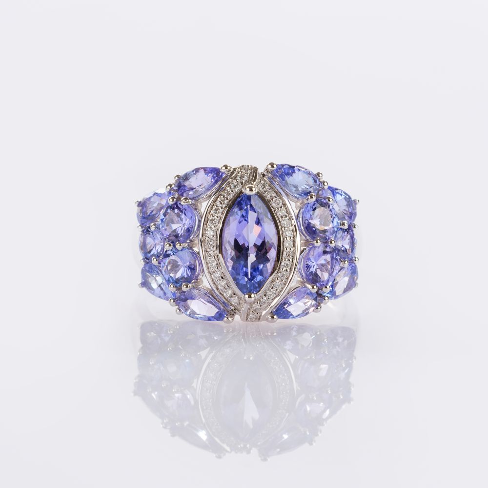 18 kt. WG, gest., MZ: EA. Verbreiterte Schauseite mit zentralem Tansanit im Marquiseschlliff ca. 1 ct.(ca. 5 x 9,6 x3,2 mm), umfasst von 14 kl. Tansaniten im Oval- und Tropfenschliff sowie 30 Kleinstbrill. zus. ca. 0,10 ct., Weiß (H), SI. Weite 59/60, Gew. ca. 6 g. -
