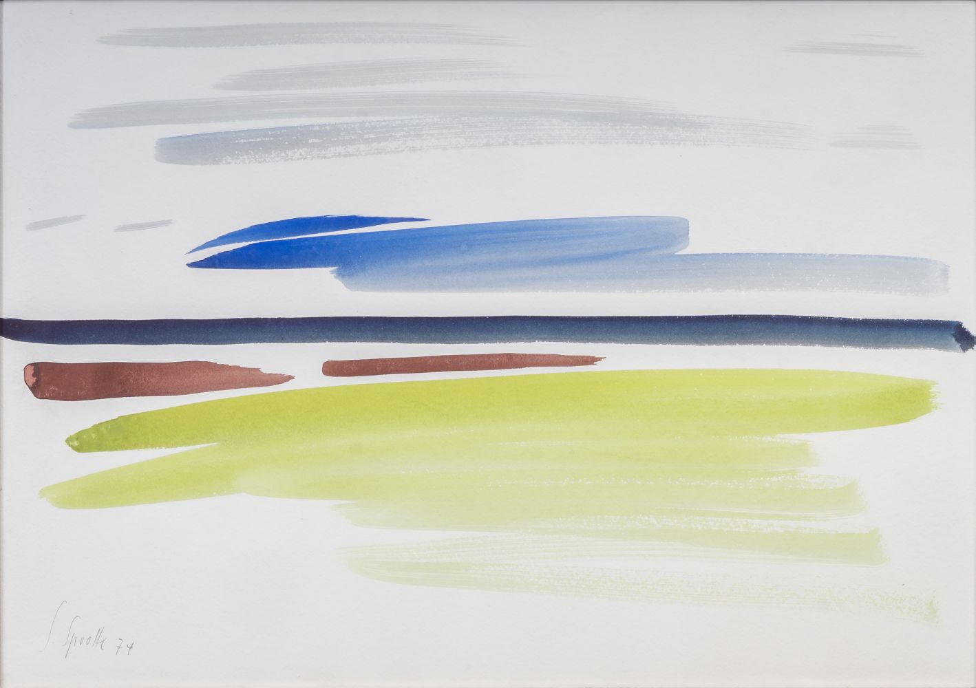 1974. Aquarell. 48,5 x 68,5 cm. L. u. sign. und dat. S. Sprotte 74, unter Glas gerahmt, ungeöffnet. - Maler und Zeichner mit kunstphilosophischem Hintergrund. S. schuf Landschaften, Marinen, Stillleben und Bildnisse. Er war Schüler von Emil Orlik in Berlin und Meisterschüler bei Karl Hagemeister in Werder/Havel. Er ließ sich in Kampen auf Sylt nieder, wo er zu einem Mittelpunkt des künstlerischen Lebens wurde. Den kalligraphisch anmutenden Arbeiten seiner Reifezeit gelingt es, mit wenigen präzisen Strichen die unterschiedlichsten Stimmungen von Meer und Wetter ins Bild zu setzen. Mus.: San Francisco (Mus. of Modern Art), Shanghai, Moskau, Stuttgart, Husum u.a. Lit.: Vollmer, U. Schulte-Wülwer: Künstlerinsel Sylt u.a.