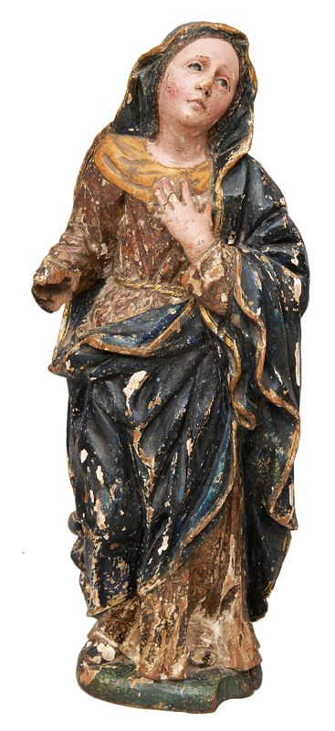 Südamerika, 18. Jh. Holz, geschnitzt und farbig gefasst, Glasaugen. Stehende Maria mit erhobenemem Blick, im blauen Umhang gehüllt. Besch. H. 43,5 cm.