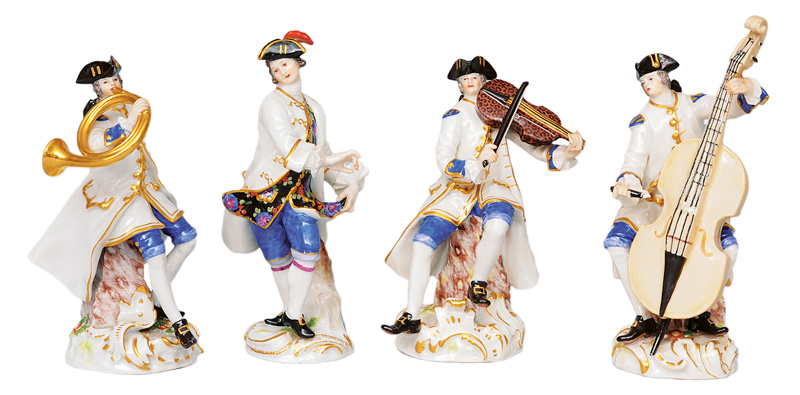 Meissen, um 1910. 4 Musikantenfiguren auf Rocaille-Sockeln, tlw. polychrom staffiert und mit Gold-Dekor. In bewegter Geste ihre Instrumente spielend (Bass, Parforcehorn, Bratsche und Tänzer). Jubiläumsedition zum 200. Geburtstag der Meissener Manufaktur (1910). Wohl nach einem Entwurf aus dem 18. Jh. (Vgl. Meissen, Figuren, Bd. II, Tanzpaare Bl. 2). Schwertermarke mit Knauf, Ritzzeichen und Jubiläumssign. 2 Figuren best. und rest. H. 13 - 16 cm.