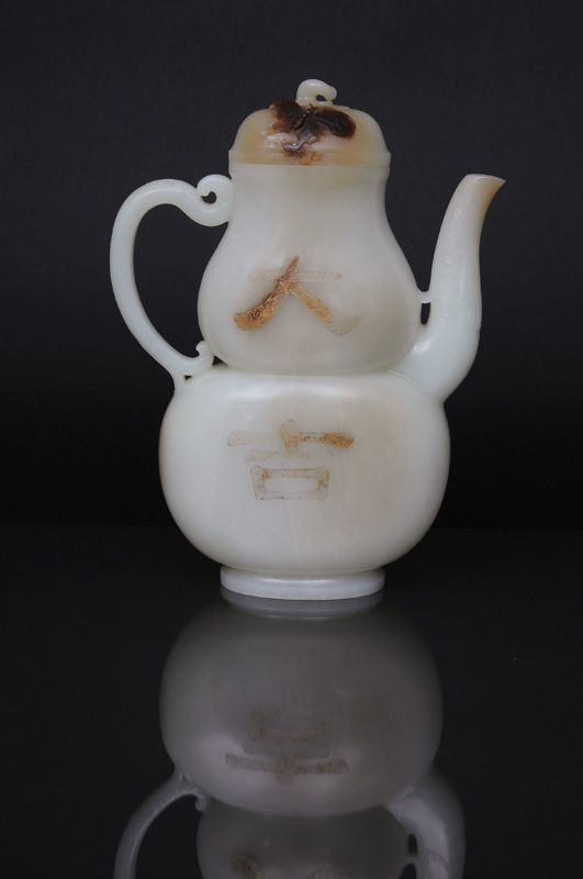 China, Qing-Dynastie (1644-1911). Weiße Jade mit partieller brauner Äderung, geschnitzt und geschliffen. Elegante Kalebassen Form mit hoher Tülle und geschwungenem Henkel. Beidseitig auf der Wandung vergoldete Inschrift: Auf einer Seite großes Glückszeichen 'Daji' (大吉). Andere Seite mit feiner Gedichtinschrift mit 55 Zeichen. Darin Zeilen eines Gedichts aus der Tang-Zeit von Wang Wei. Deckel mit Schmetterlings-Relief und naturalistischem Knauf. Die partielle braune Äderung auf sehr delikate Weise in den Gesamt-Dekor übernommen. Die durchscheinende Jade von einer exquisiten und ebenmäßigen weißlichen Tönung. Vierzeichen Qianlong-Marke. H. 25 cm. - Die Gedichtinschrift enthält Zeilen aus dem berühmten Gedicht 'Written at My Wang River Retreat after a Steady Rain' (積雨輞川莊作) des bedeutenden Dichters Wang Wei (王维, 701-761). Die Werke Wang Weis wurden 1705 in der umfassenden Gedichtsammlung 'Quantangshi' (全唐詩) zusammengestellt und erfreuten sich im 18. Jh. einer großen Wertschätzung seitens des kaiserlichen Hofes. Für eine Jade-Schnitzerei in Dop-pelkürbis-Form in Kombination mit den Wunschzeichen 'Daji' aus der Qianlong-Periode, heute im Palast Museum, Peking, vgl. The Complete Collection of Treasures of the Palace Museum: Jadeware (II), Hong Kong 2008, Nr. 71.