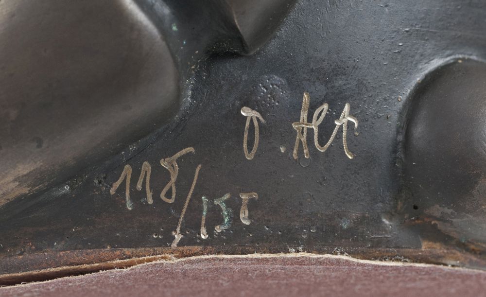 1992. Bronze, braun patiniert, teils grün gefasst. Verso geritzt sign. 'O. Alt', num. Auflage '118/150'. H. 23,5 cm, Dm. 12 cm. - Deutscher Maler, Designer und Bildhauer. A. studierte 1960-1966 an der Hochschule für Bildende Künste in Berlin, u.a. als Meisterschüler von Prof. H. Bachmann. Neben H. Antes und HAP Grieshaber gehört Alt zu den Vertretern der 'Neuen Figuration' in Deutschland.