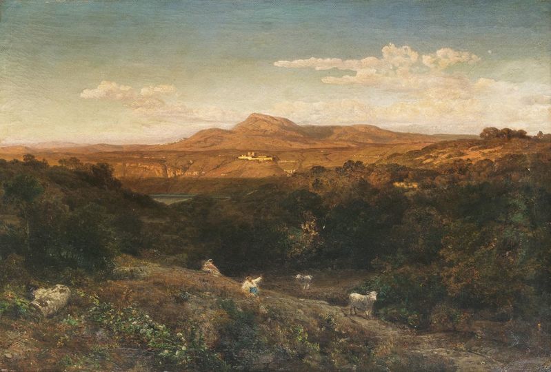 Öl/Lw., 66 x 99 cm, r. u. sign. Valentin Ruths Roma sowie undeutlich dat. wohl 1856, min. rest., doubl. - Hamburger Landschafts- und Architekturmaler. R. studierte an der Münchner Akademie sowie als Schüler von J. W. Schirmer an der Düsseldorfer Akademie, darauf lebte er einige Jahre in Italien. Spätromantische aber niemals sentimentale Landschaften Italiens und Norddeutschlands prägen sein Oeuvre. Mus.: Hamburg (Kunsthalle, Altonaer Mus.), Berlin, Bremen, Breslau, Flensburg, Kiel u.a. Lit.: Thieme-Becker, Der Neue Rump u.a.
