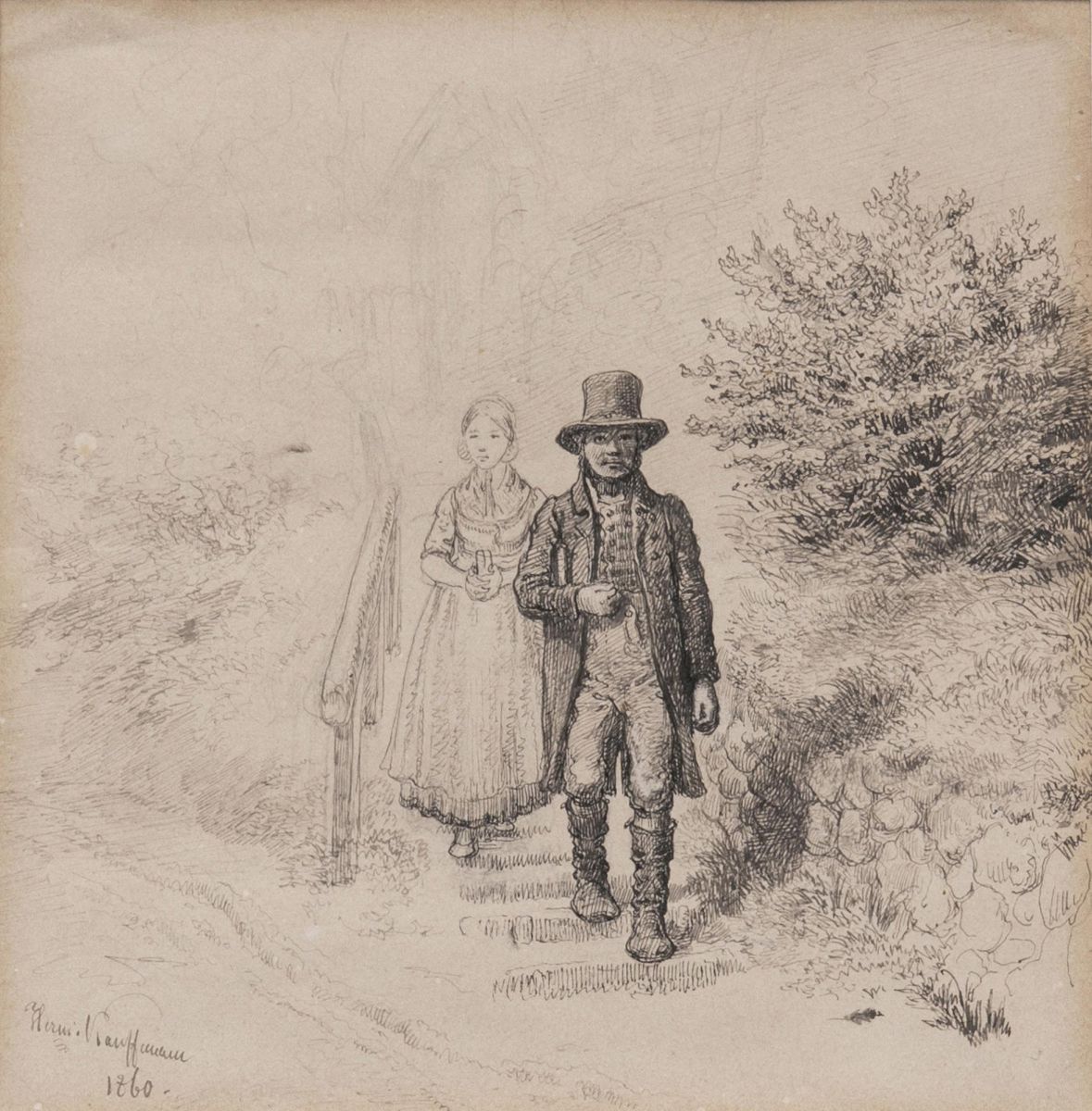 Federzeichnung, 18 x 17,5 cm, l. u. sign. und dat. Herm. Kauffmann 1860, unter Passepartout und Glas gerahmt, ungeöffnet. - Landschafts-, Genremaler und Radierer. K. studierte an der Münchner Akademie, von wo aus er mit Haeselich, Gensler und Morgenstern Kontakt aufnahm. Mehrere Studienreisen führten ihn ins bayrische Hochland, nach Norwegen und Tirol. Er bevorzugte die Darstellung ländlicher Volksszenen, Motive aus Holstein, der Heide und von der Ostsee. Mus.: Hamburg, Berlin, Dresden, Hannover, Kiel, Darmstadt, Leipzig, Prag, Stettin u.a. Lit.: Thieme-Becker, Bénézit, Boetticher, Der Neue Rump u.a.