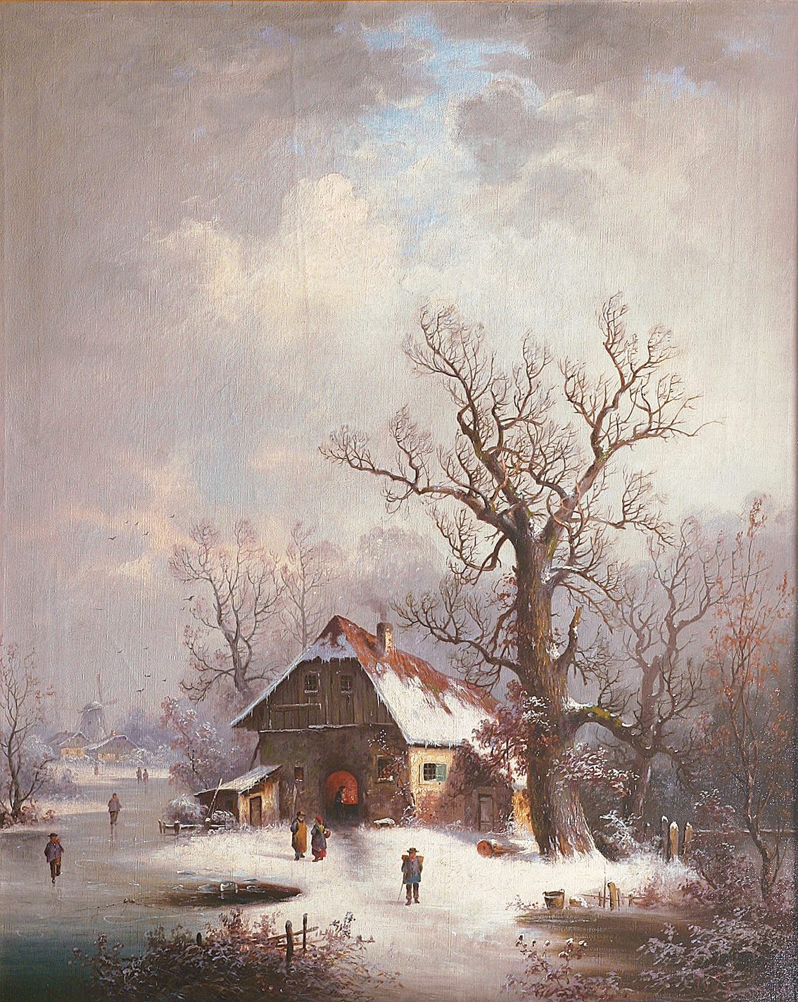 Winterlandschaft mit Schmiedewerkstatt, Windmühle und Eisgängern
