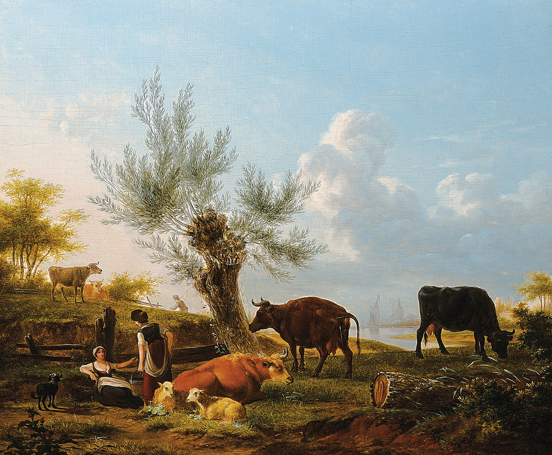 Weidelandschaft mit Hirtenmädchen, Schafen, Kühen und ferner Stadt
