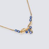 14 ct. yellow gold, marked. In front 8 oval cut sapphires (varying approx. 4 x 3 x 1,7 mm) with 15 small white pastes. Center piece 39 x 14 mm, necklace in total 44 cm, weight approx. 9 g. -