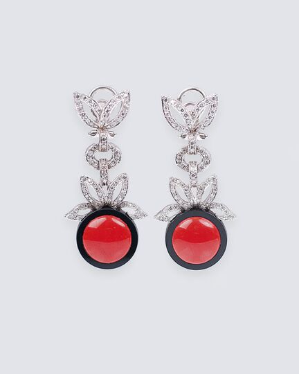 A Pair of Ear Pendants with Coral, Onyx and Diamonds