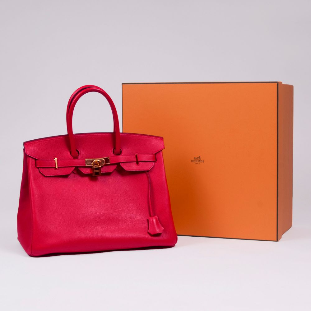 Red leather, gold coloured fittings. Inside 1 zipped compartment and 1 large inside pocket. With keys, padlock, clochette. Sign. 'HERMÈS PARIS MADE IN FRANCE', blind stamp. Dustbag, original box. Mint condition. -