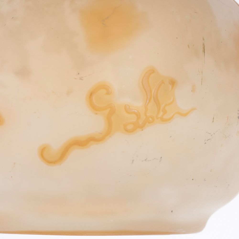 Nancy, around 1900. Opaque, white-orange glas with orange overlay and multiple etched decor relief in shape of poppy blossoms and leaves. Sign. on the wall 'Gallé'. Traces of usage. H. 28,5 cm. - One of the most famous glass artists of the French Art Nouveau. Many designs of ceramic, glass and furniture in the style of historicism and art nouveau. Studied in Weimar and Meisenthal, staied in London and Paris, the first successes at the World Exhibition in Paris in 1878. - Mus: represented in leading art museums in the world. - Lit: B. Hakenjos, Emile Gallé, München 2012.