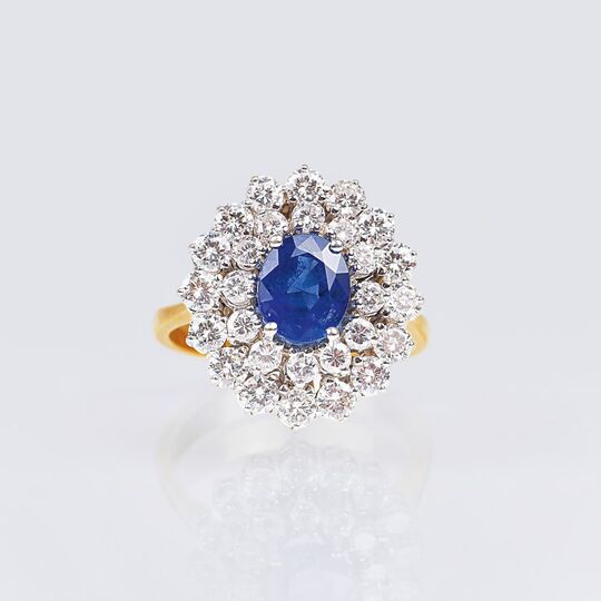 18 ct. yellow and white gold, marked. White gold ringtop with fine coloured sapphire in Ceylon blue in oval cut 1,62 ct. (approx. 7,4 x 6,1 x 4 mm) with 28 small round brillant cut diam. in total approx. 1,60 ct. Rare White(G).vs. Ring in yellow gold added. Size 53, weight approx. 6,4 g. Details according to jewellery passport by Danilschenko Jeweller dated 1992. We thank the Gemmologisches Institut Hamburg for the oral statement regarding the natural sapphire. -
