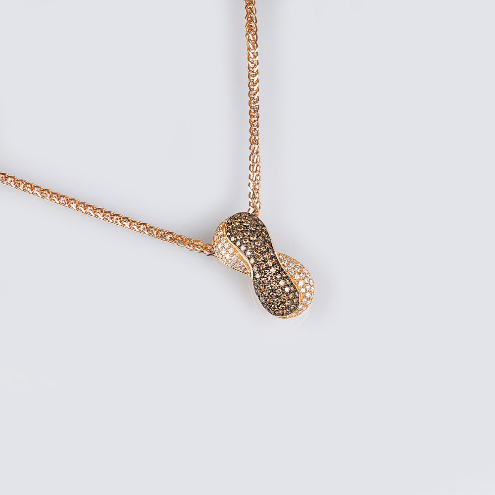 18 ct. red gold, marked. In pavésetting 132 round brillant cut diam. in brown and rare white in total approx. 2,37 ct. vvs-si. on partly two coloured gold base. Pendant 30 x 14 mm, necklace L. 45 cm, weight approx. 21 g. -