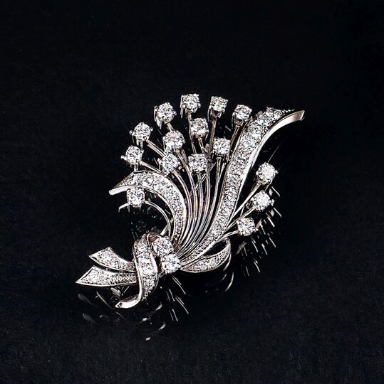 18 ct. white gold, marked, MM indistinctly. With 43 diam. in round brillant and 8/8 cut in prong and pavé setting in total approx. 2 ct. Rare White(G)-Slightly Tinted White(I).vvs. 48 x 27 mm, weight approx. 12,5 g. -