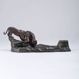 Around 1900. Bronze, olive green patinated. Bowl with inkpot and two drinking lionesses. Signed 'Tu(o)scA', foundry stamp probably foundry Arthur Rubinstein. H. 15 x l. 42 x w. 18 cm. -