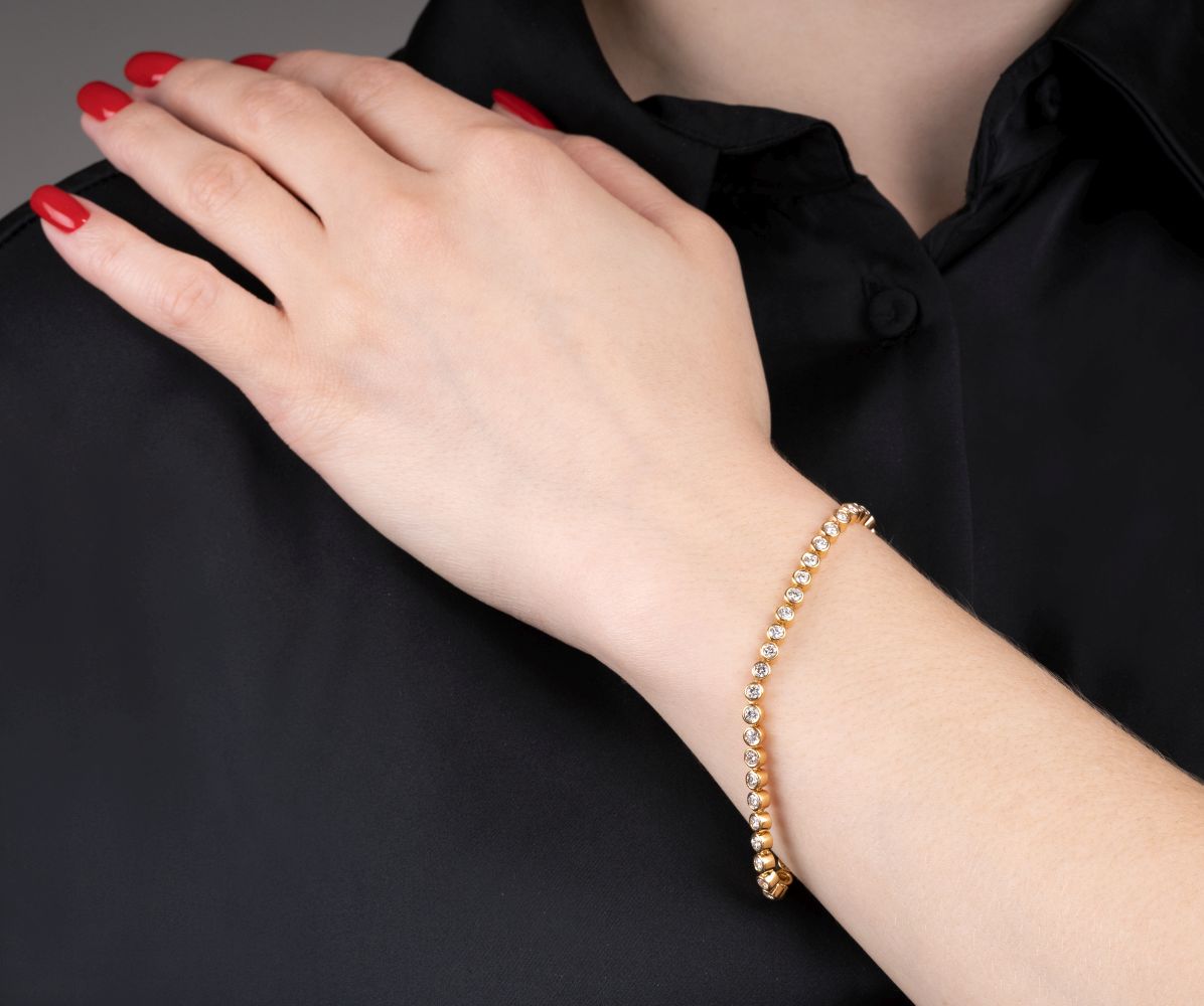 18 ct. yellow gold, marked. All around in bezel setting 46 round brillant cut diam. in total approx. 3,20 ct. Rare White(G).vvs. W. 4 mm, l. 18,5 cm, weight approx. 11,5 g. -