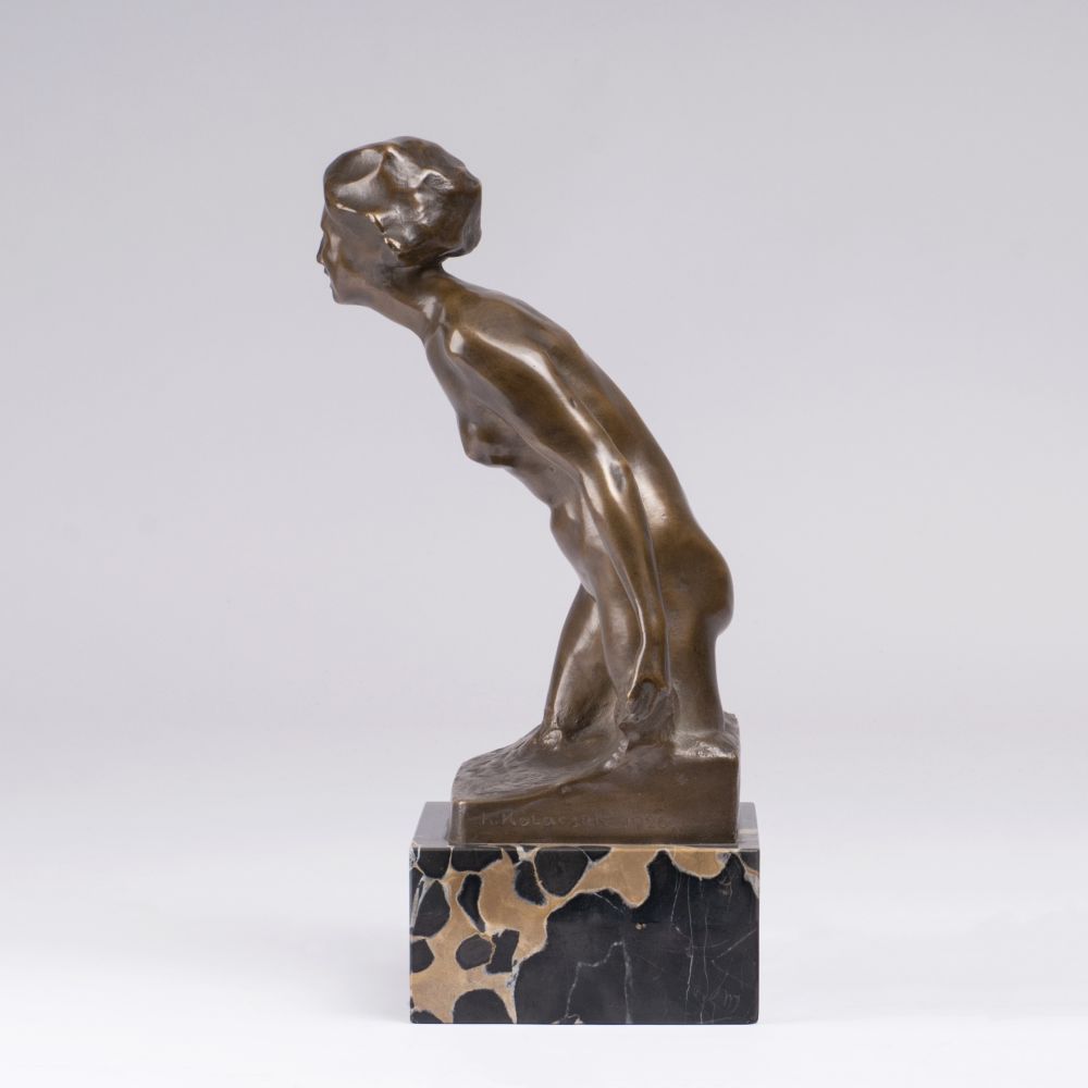 1926. bronze, brown patinated. Signed and dated on the side. 'K. Kolaczek 1926' and inscribed 'LIL ANYZ'. Figure: h. 24,5 cm, marble base (min. chipped.): h. 6 cm. - Bohemian sculptor, graduate of the Vienna School of Applied Arts, active in wood, ceramics and bronze.