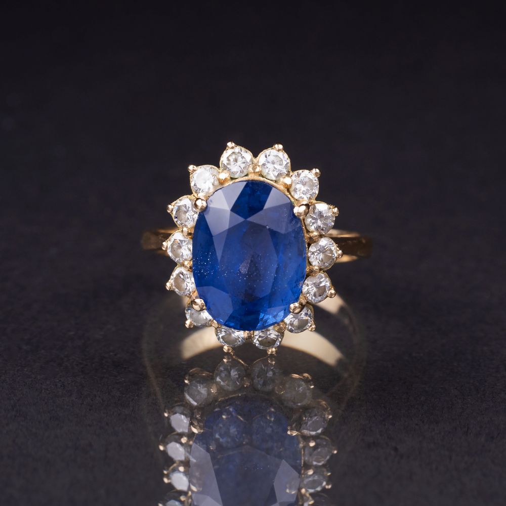 14 ct. yellow gold, marked. The unheated Ceylon sapphire in oval cut approx. 6 ct. (approx. 12,5 x 9,3 x 6,84 mm) with 14 round brillant cut diam. in total approx. 0,85 ct. White(H)-Slightly Tinted White(J).vs-P. Ringtop 18 x 15 mm (slightly bent), size 54, weight approx. 6,2 g. Heat treatment cannot be detected according to report of Gemmologisches Institut Hamburg dated 2021. -