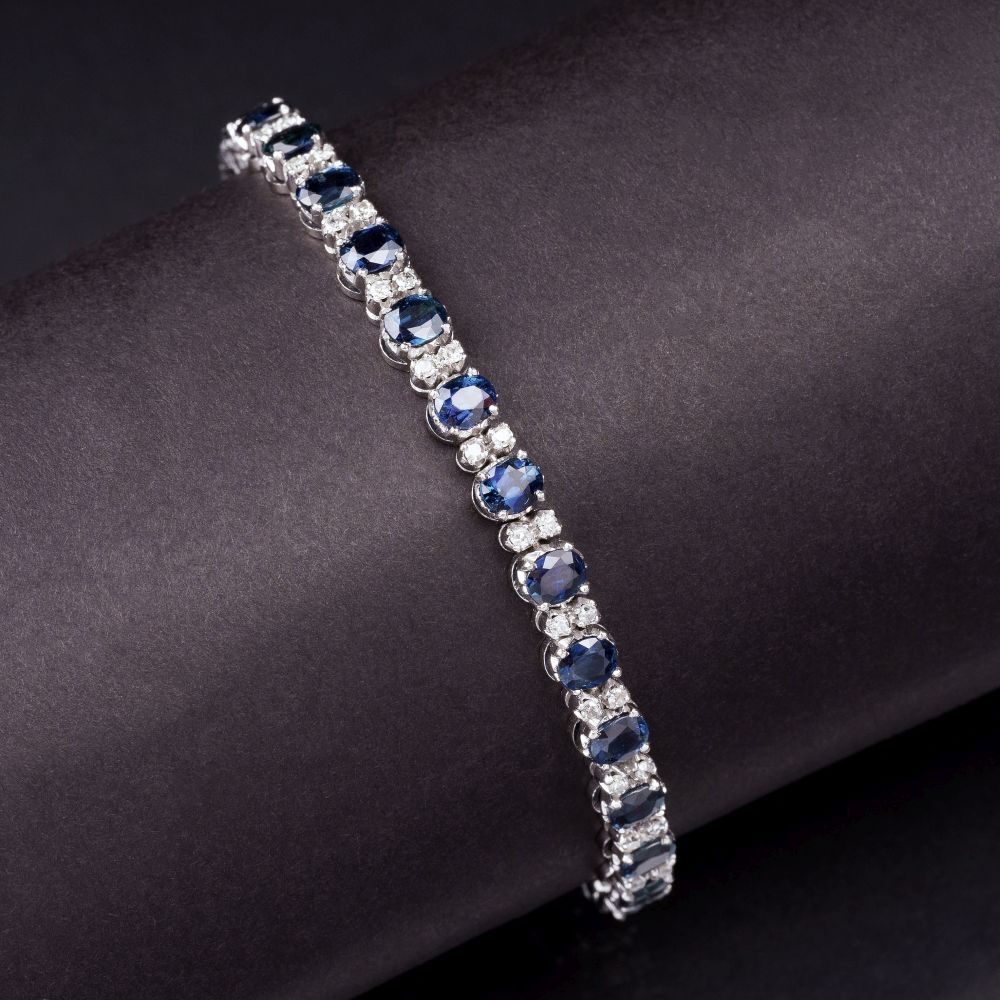14 ct. white gold, marked. All around set with 27 sapphires in oval cut in total aprpox. 8,50 ct. in prong settings (approx. 4,6 x 3,5 x 2 mm) and 54 small diam. in 8/8 cut in total approx. 1 ct. Slightly Tinted White(J).si-P. W. 5,5 mm, l. approx. 19,5 cm, with safetychain weight approx. 16,5 g. -