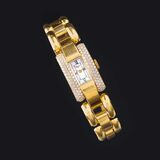 Around 1995. 18 ct. yellow gold, marked. Quartz. Light dial, roman numerals, indices, central hands, labelled 'Chopard Genève Swiss Made' (small scratches). On the side marked 'Chopard', reverse numb. 433 1 465318 10/6547. With 116 pavéset round brillant cut diam. in total approx. 2,30 ct. Rare White(G)--White(H).vvs. Small folding clasp with small round brillant cut diam. by Chopard. 30 x 18 mm, l. approx. 18 cm, weight approx. 96 g. -