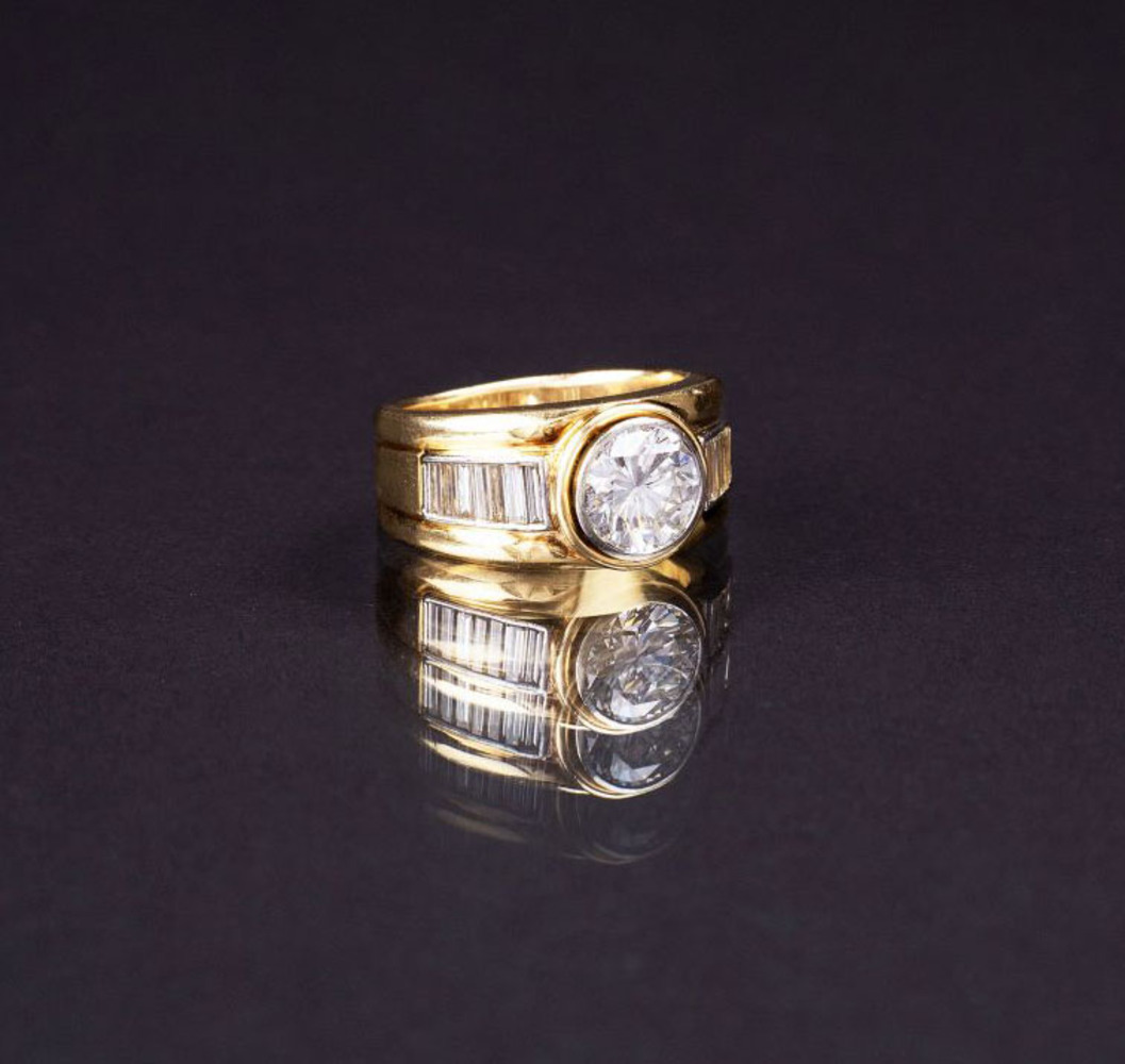 14 ct. yellow and white gold, marked. In front enlarged, in bezel setting the solitaire in round brillant cut approx. 1,83 ct. Rare White(F/G).if (internally flawless, approx. 7,84 x 4,74 mm) with 14 diam. in baguette cut in total approx. 0,75 ct. Rare White(G).vvs-si. In front w. 10 mm, size 55, weight approx. 12,8 g. Details about the solitaire diam. according to Taxat Juwelier Horwitz 1971 and estimateJuwelier Mahlberg 1995. -