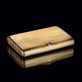 Moscow, around 1880 - 90. 14 ct. yellow and red gold, marked 56, MM: cyrillic JuZ unknown. Very few, minimal scratches. All around flute ornaments in two coloured gold. Saphir cabochon as clasp, small compartment for leighters. Inside dedication. 9,5 x 6,5 cm, weight approx. 131 g. - Provenance: Estate of Countess Finck von Finckenstein-Brinkama -