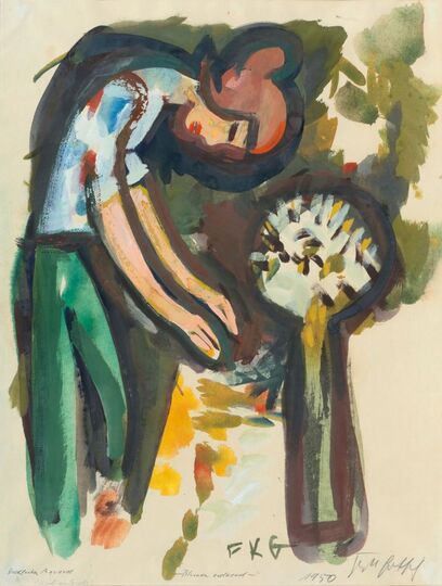 1950. Gouache and watercolour. 68 x 51 cm. Lo. ri. sign. and dat. FKGotsch 1950, matted and framed under glass. - German landscape painter. G. was pupil of H. Ralfs in Kiel, and studied at the Dresden Academy under O. Hettner a. O. Kokoschka since 1920. Together with Hilde Goldschmidt he studied at the Académie Colarossi in Paris in 1926/27, followed by study trips to the USA, to Paris, Italy and Munich. After WW II, when he lost most of his oeuvre, he settled in St. Peter-Ording on the shore of the North Sea. 1949-51 he taught at the 'Baukreis', an art school founded by A. Fiedler in Hamburg. In 1971 the F.-K. Gotsch trust was founded. Among his prizes is the Villa Romana award. Mus.: Los Angeles, Genf (Petit Palais), Schleswig (SHLM), Würzburg a. others. Lit.: Vollmer, P. Goeritz u.a.: Friedrich Karl Gotsch, Werkverzeichnis der Gemälde, Schleswig 1992 a. others.