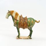 China. Tang Dynasty or The Five Dynasties, 8th-11th cent. Burnt clay, hollow inside, three color glaze (sancai). H. 38,5 cm. Standing on a rectangular plinth, with a slender head and long mane, saddle with high gussets and fur saddlecloth, the bridle decorated with palmettes and shell-like pendants, the tail tied with ribbons, covered with a three-color glaze (sancai) - Expertise: The TL report by the Ralf Kotalla laboratory, Haigerloch, dated March 2nd, 2023, dates the last time of firing of the object to the year 893 AD (+/-14.5%) - Provenance: South German private collection -
